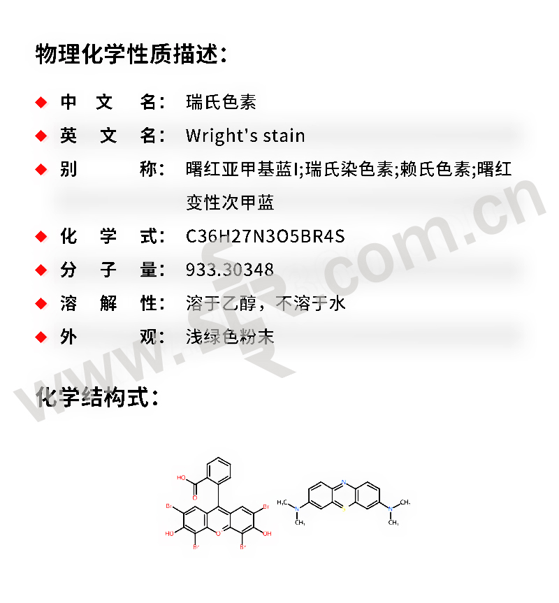 ·中文名称:瑞氏色素·英文名称:Wrightstain·分子式:C36H27N3O5Br4S·分子量:933。3·性状:浅绿色粉末。系复合中性染色剂。对原生质的染色有区别嗜中性、嗜碱性和嗜酸性部分的作用。溶于乙醇、不溶于水。最大吸收波长640(522)nm。