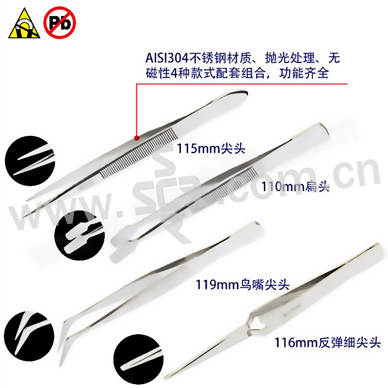 ·极细镊子头与轻巧设计,适用于各种电子业、半导体业、饰品珠宝、钟表眼镜加工维修使用。