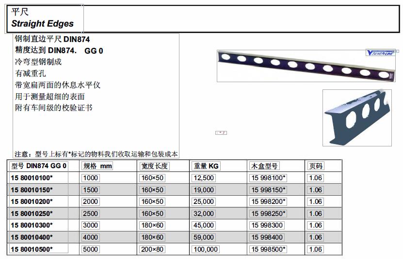 ·钢制直边平尺DIN874精度达到DIN874. GG 0 冷弯型钢制成 ·有减垂孔 ·带宽扁两面的休息水平仪用于测量超细的表面 ·附有车间级的校验证书