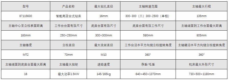 订货号 制造商型号 最大钻孔直径 立柱直径 主轴最大行程 主轴中心线至立柱表面距离 主轴端至工作台面最大距离 主轴端至底座最大距离 主轴锥度 主轴转速范围 主轴转速级数 工作台面尺寸 底座工作面尺寸 电动机功率 额定电压 净重 价格 购物车