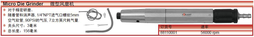 ·对于精密研磨。 ·随着管和消声器,1/4″NPT进气口螺纹5mm ·空气软管,90PSI的气压,7立方英尺耗气量. ·夹头尺寸:3毫米 ·总长度:156毫米