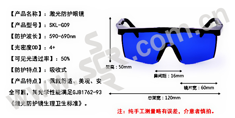 ·是一种高效安全的护目镜 ·适用于多种激光器 ·配戴舒适、美观、安全可靠 ·其光学安全性能完全满足GJB1762-93《激光防护镜生理卫生标准》 ·这款激光安全眼镜是反射式的,可全方位防护特定波段1064NM的激光和强光 ·可见光透过率达到85%以上,光密度为5。0以上,(OD+5,OD+6),衰减率较高(10-6·有CE认证和国家实验室检测报告