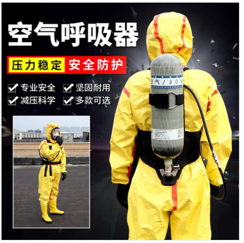 阻燃全面罩,具有防雾功能,球形面罩,视野率满足要求 背带及腰带采用芳纶材质,具有阻燃性能 ·6.8L碳纤维气瓶 气瓶质量轻,储气量大,配有阻燃保护套,配自锁瓶阀,防止意外关闭 ·供气阀外观黄色醒目,363度快速插接,操作方便,供气阀输出压力稳定,呼吸舒适度高