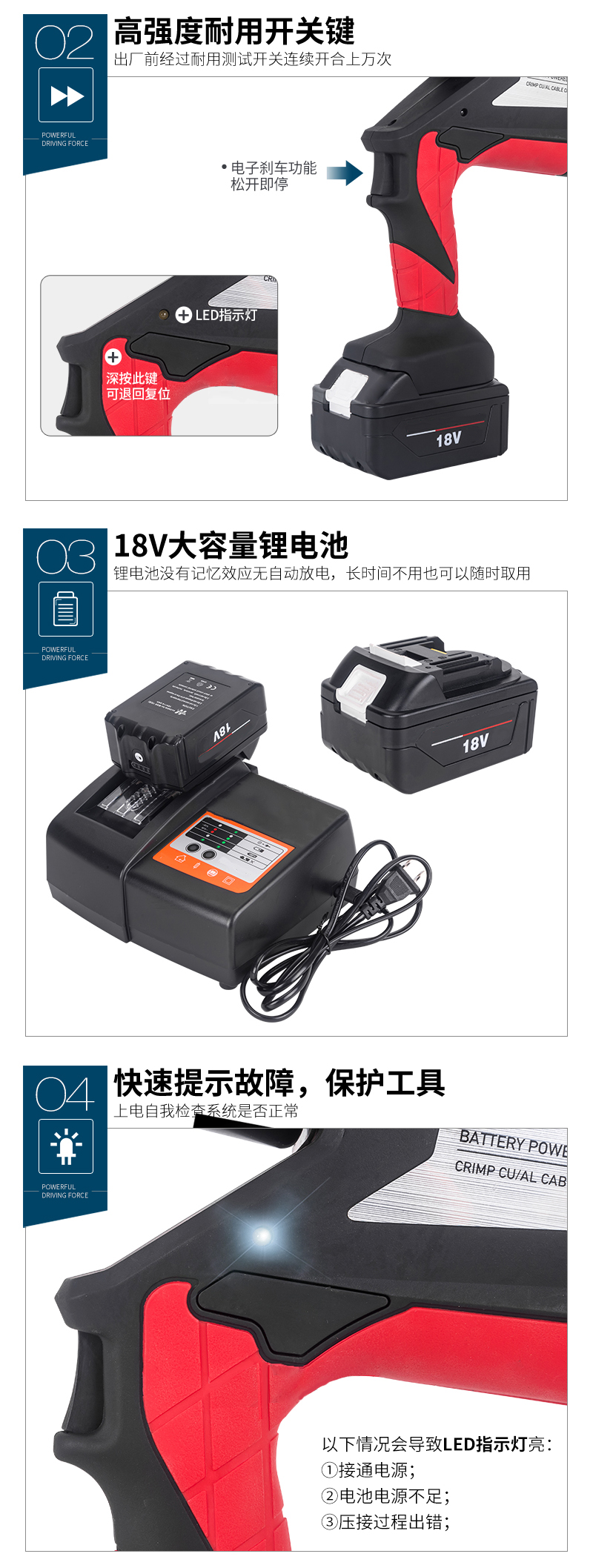 ·电池余电及电压油压显示更直观 ·强劲高容量18V锂电池驱动,用途广泛 ·握把符合人体工程学,操作舒适 ·设有加油口,易于维护 ·坚固的铁箱包装箱,储放工具和配件