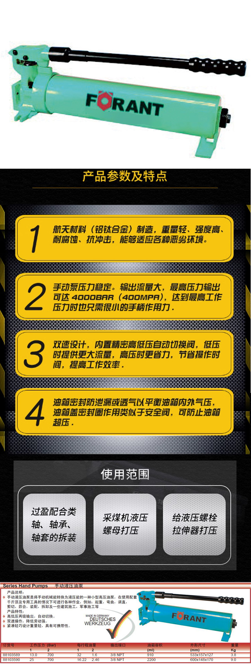 ·手动液压油泵是将手动机械能转换为液压能的一种小型高压油泵,在使用配套千斤顶及专用工具的情况下可进行各种作业,