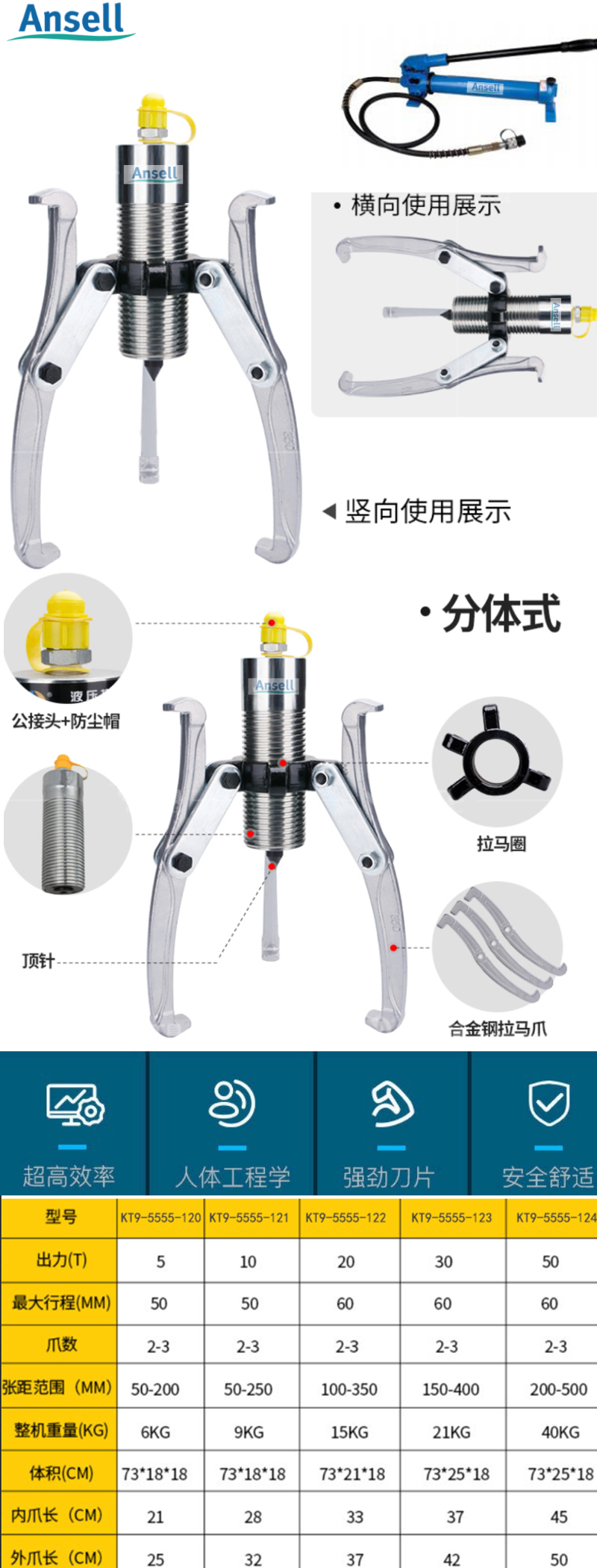 工业级分体式液压拉马器拔轮器含手动泵套装