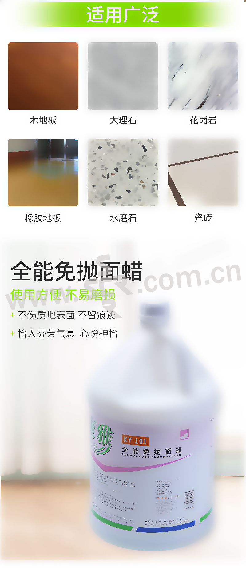 ·特殊配方之高分子聚合物,附着力强,坚固光亮无需抛光,使用方便,高强的坚韧性令蜡面不易磨损。