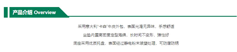 ·采用意大利“卡森”牛皮外包,表面光滑无异味,手感舒适 ·坐垫内置高密度定型海绵,长时间不变形,弹性好 ·底座采用优质托盘,表面经过静电粉末喷塑处理,可防腐防锈