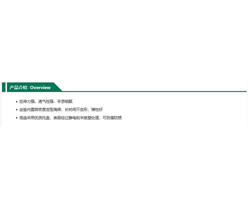 ·拉伸力强,透气性强,手感细腻 ·坐垫内置高密度定型海绵,长时间不变形,弹性好 ·底座采用优质托盘,表面经过静电粉末喷塑处理,可防腐防锈