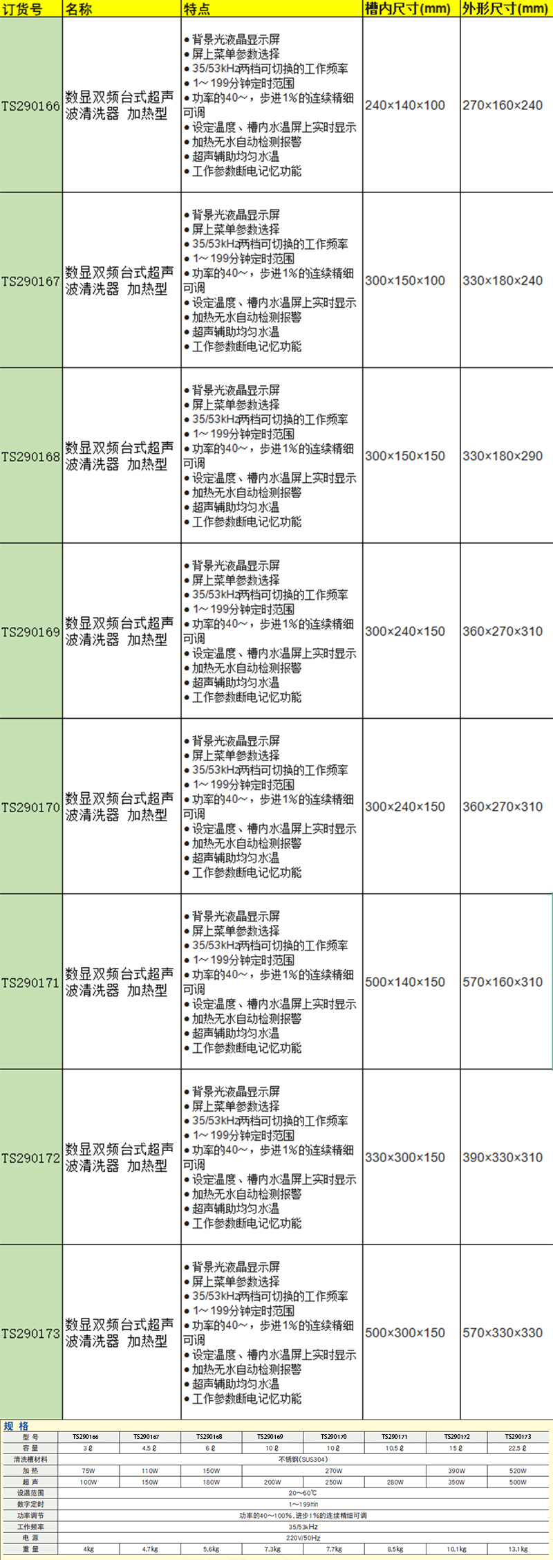 · 背景光液晶显示屏 · 屏上菜单参数选择 · 35/53kHz两档可切换的工作频率 · 1~199分钟定时范围 · 功率的40~,步进1%的连续精细可调 · 设定温度、槽内水温屏上实时显示 · 加热无水自动检测报警 · 超声辅助均匀水温 · 工作参数断电记忆功能