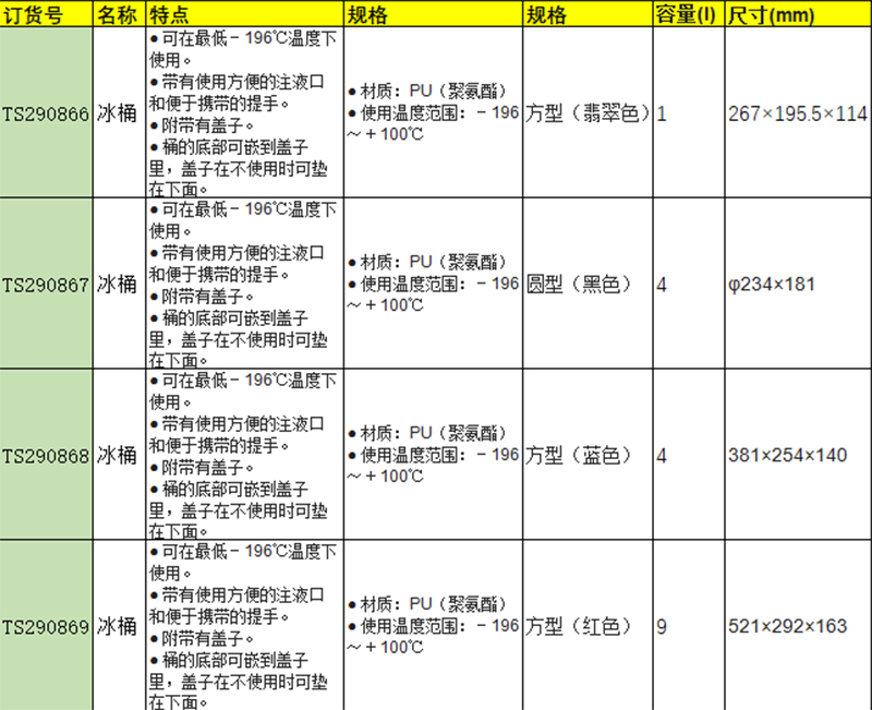 · 可在最低-196℃温度下使用。 · 带有使用方便的注液口和便于携带的提手。 · 附带有盖子。 · 桶的底部可嵌到盖子里,盖子在不使用时可垫在下面。