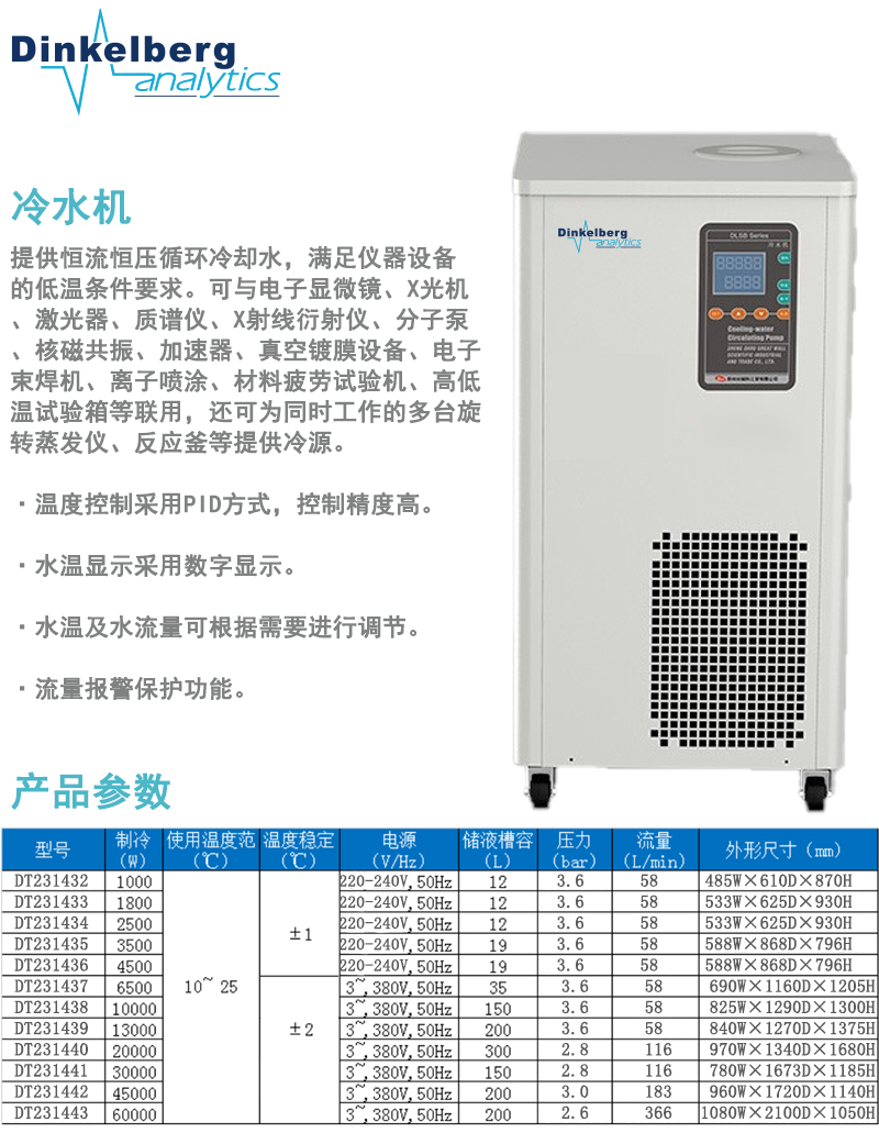 .流量报警保护功能,避免因长时间循环水流量不足,影响用冷设备运转率.。制冷压缩机采用国际品牌产品,故障率低,寿命长,