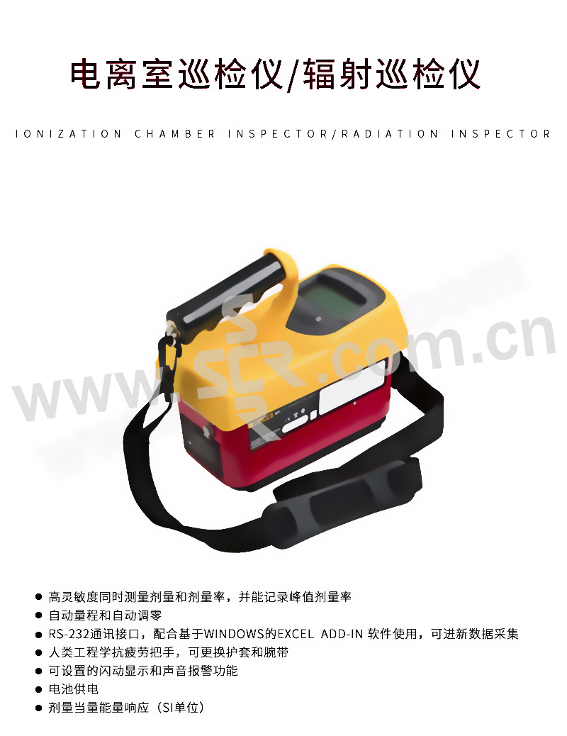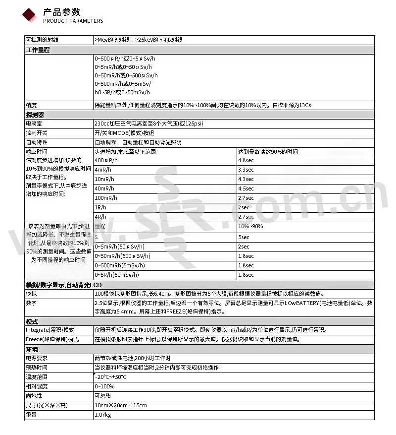 ·过载:如果F451P型电离室巡检仪/辐射巡检仪测量的瞬时辐射率超过50 R/h(0.5 Sv/h),R/h单位中的“R及Sv/h单位中的“Sv将闪烁,提示用户辐射场超过了仪器的测量范围。此外,在这种条件下,测得的积分辐射值可能会有潜在的误差。在清除积分值后,显示屏则停止闪烁。·电池电量低指示:当屏幕上首次显示“LOW BATTERY标记时,还可使用大约6个小时的工作时间。当“LOW BATTERY标记闪烁时,则能够工作的时间不足1个小时。这些时间都是指安装两块电池,并且从第一次发生这些状态计算