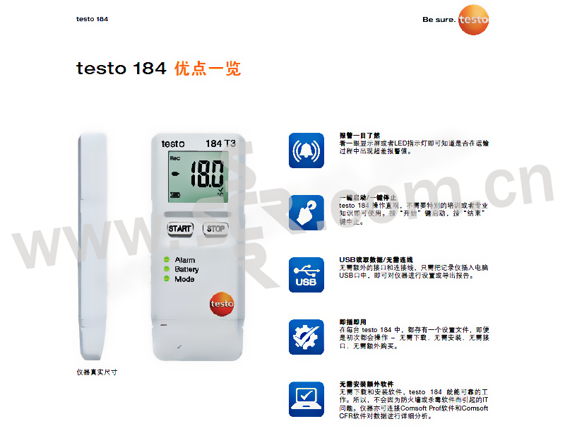 ·USB连接,仪器配置及报告读取无需额外电缆,无需安装额外软件,直接生成PDF报告,即插即用·用于仓储及运输过程中的温度监测·可通过带有NFC功能的安卓手机进行现场数据读取·符合GxP, 21 CFR Part 11, HACCP和EN 12830规范
