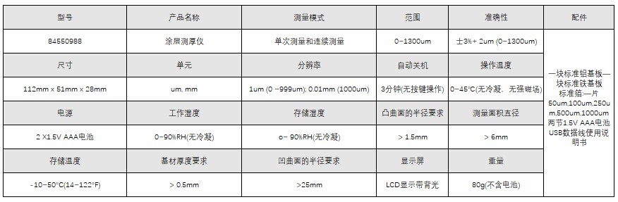 一块标准铝基板—块标准铁基板 标准箔:—片50um,100um,250um,500um,1000um 两节1.5V AAA电池 USB数据线使用说明书