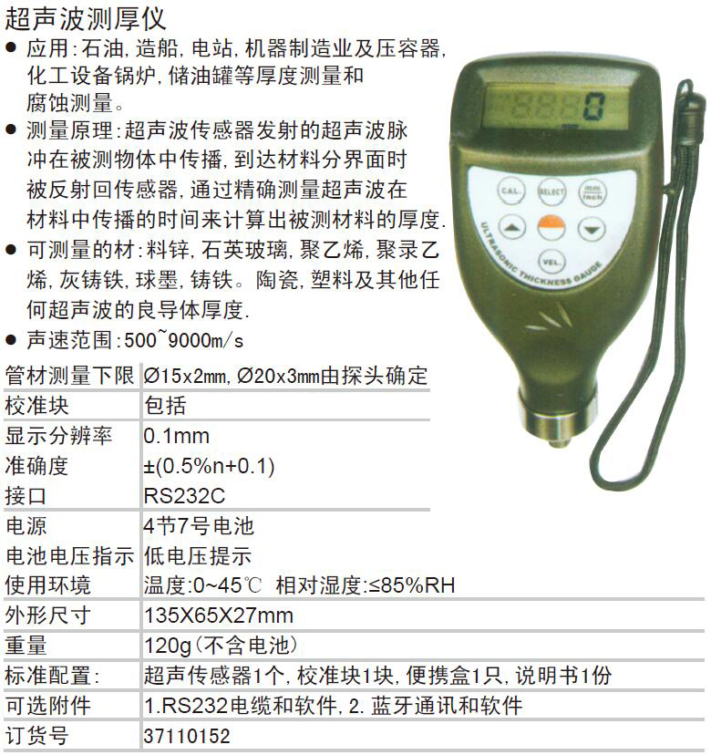 ·测量原理:超声波传感器发射的超声波脉冲在被测物体中传播,到达材料分界面时被反射回传感器,通过精确测量超声波在材料中传播的时间来计算出被测材料的厚度. ·可测量的材:料锌,石英玻璃,聚乙烯,聚录乙烯,灰铸铁,球墨,铸铁。陶瓷,塑料及其他任何超声波的良导体厚度.