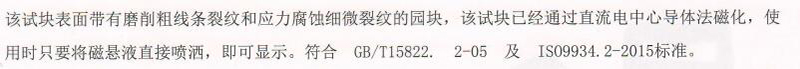 ·该试块表面带有磨削粗线条裂纹和应力腐蚀细微裂纹的园块,该试块已经通过直流电中心导体法磁化,使用时只要将磁悬液直接喷洒,即可显示。符合 GB/T15822.2-05及IS09934.2-2015标准。