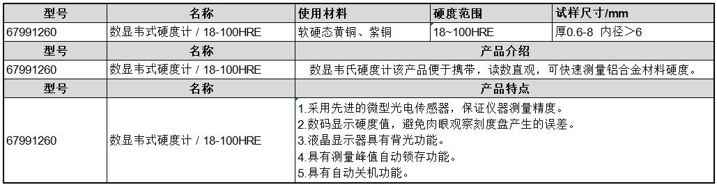 ·采用先进的微型光电传感器,保证仪器测量精度。 ·数码显示硬度值,避免肉眼观察刻度盘产生的误差。 ·液晶显示器具有背光功能。 ·具有测量峰值自动锁存功能。 ·具有自动关机功能。 ·数显韦氏硬度计该产品便于携带,读数直观,可快速测量铝合金材料硬度。