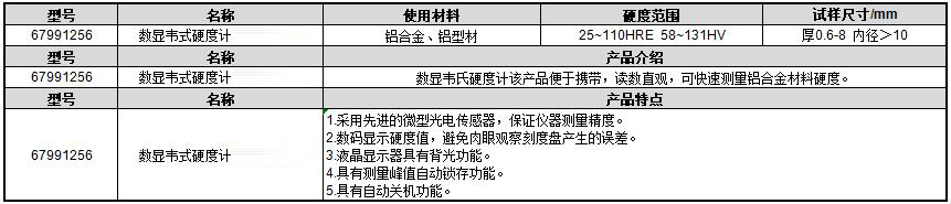 ·采用先进的微型光电传感器,保证仪器测量精度。 ·数码显示硬度值,避免肉眼观察刻度盘产生的误差。 ·液晶显示器具有背光功能。 ·具有测量峰值自动锁存功能。 ·具有自动关机功能。 ·数显韦氏硬度计该产品便于携带,读数直观,可快速测量铝合金材料硬度。