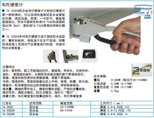 ·760020A系列韦氏硬度计适于测试铝合金型材、管材和板材,特别适于在生产现场、销售现场或施工现场对产品硬度进行快速、非破坏性的合格检查。仪器特点