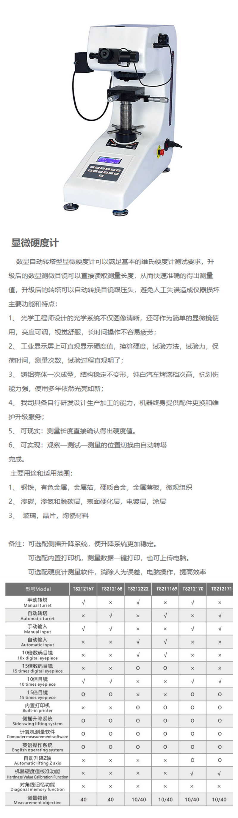 ·采用LCD显示屏,可切换硬度标尺HV或HK ·试验过程自动化,操作简便 ·高倍率光学测量系统和光学双通道结构,光源亮度可以20级调节 ·硬度换算功能 ·角线长度D1和D2值编码器输入,减少人为读数误差 ·测量结果可打印机输出 ·物镜与压头可自动切换,定位更准确