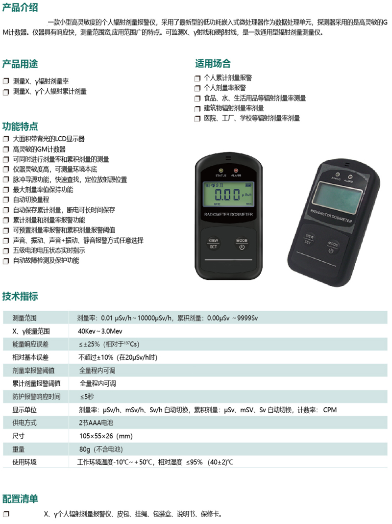 ·大面积带背光的LCD显示器 ·高灵敏的GM计数器 ·可同时进行剂量率和累积剂量的测量 ·仪器灵敏度高,可测量环境本底 ·脉冲寻源功能,快速查找,定位放射源位置 ·最大剂量率值保持功能 ·自动切换量程 ·自动保存累计剂量,断电可长时间保存 ·累计剂量和剂量率报警功能 ·可预置剂量率报警和累积剂量报警阈值 ·声音、振动、声音+振动、静音报警方式任意选择 ·五级电池电压状态实时指示 ·自动故障检测及保护功能