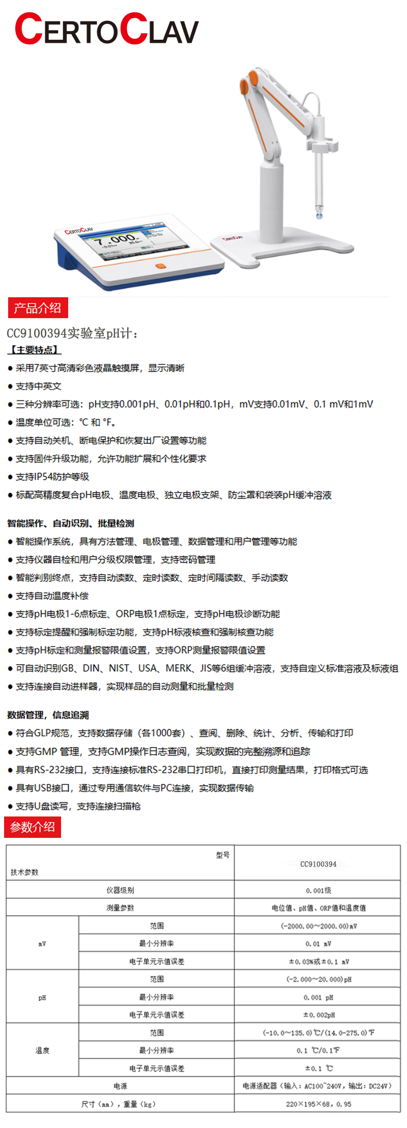 ·采用7英寸高清彩色液晶触摸屏,显示清晰; ·支持中英文; ·三种分辨率可选:pH 支持 0.001pH、0.01pH和0.1pH,mV 支持0.01mV、0.1mV和1mV; ·温度单位可选:℃和℉; ·支持自动关机、断电保护和恢复出厂设置等功能; ·支持固件升级功能,允许功能扩展和个性化要求; ·支持IP54 防护等级; ·标配高精度复合 pH 电极、温度电极、独立电极支架、防尘罩和袋装 pH 缓冲溶。
