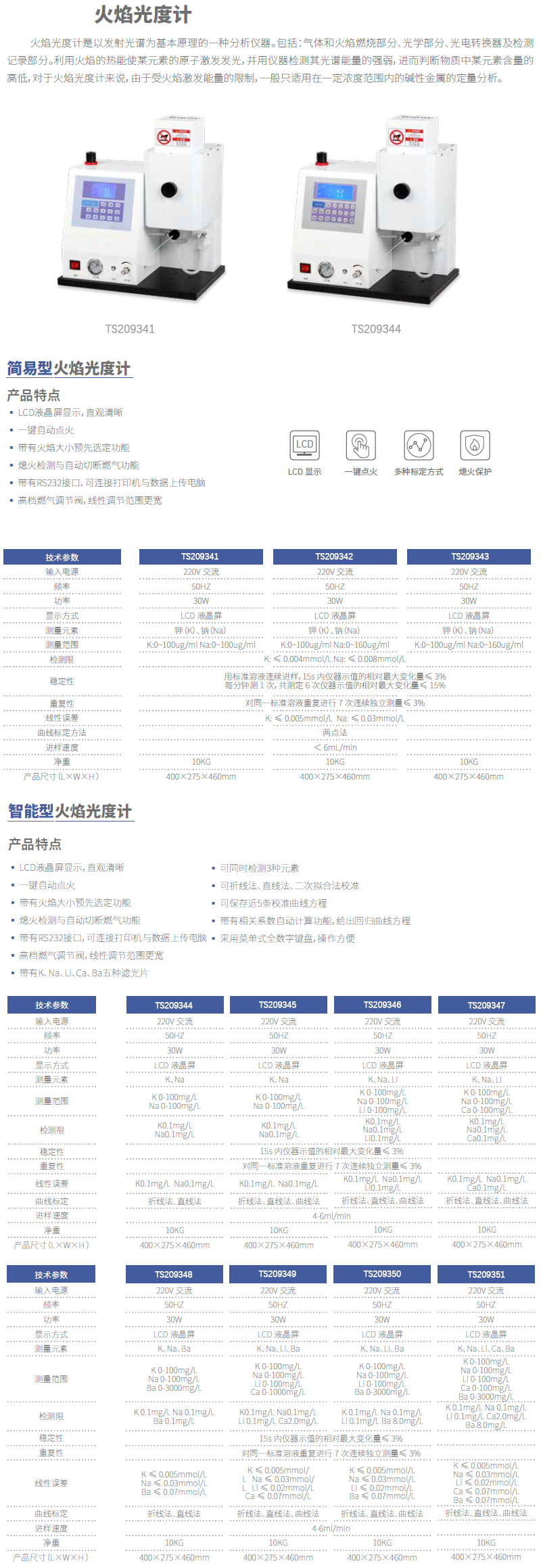 ·火焰光度计是以发射光谱为基本原理的一种分析仪器 ·包括气体和火焰燃烧部分,光学部分,光电转换器及检测记录部分 ·利用火焰的热能使某元素的原子激发发光,并用仪器检测其光谱能量的强弱,进而判断物质中某元素含量的高低 ·LCD液晶屏显示,直观清晰 ·一键自动点火 ·带有火焰大小预先选定功能 ·熄火检测与自动切断燃气功能