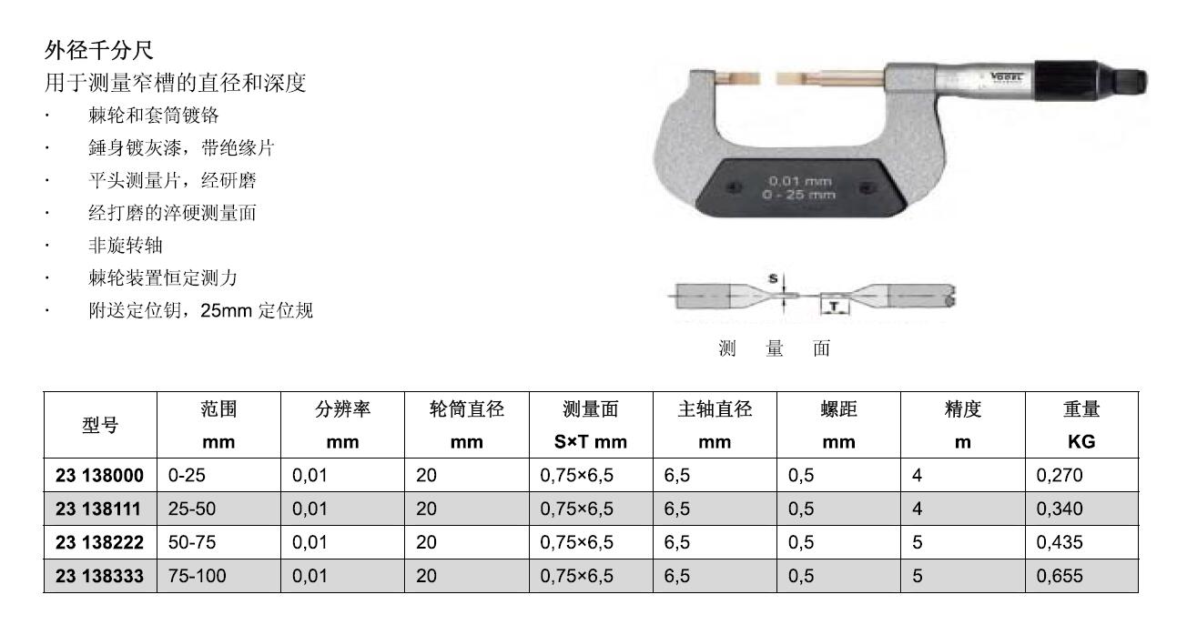 ·棘轮和套筒镀铬,錘身镀灰漆、带绝缘片 ·平头测量片,经研磨;经打磨的淬硬测量面 ·测砧长18mm ·非旋转轴 ·棘轮装置恒定测力