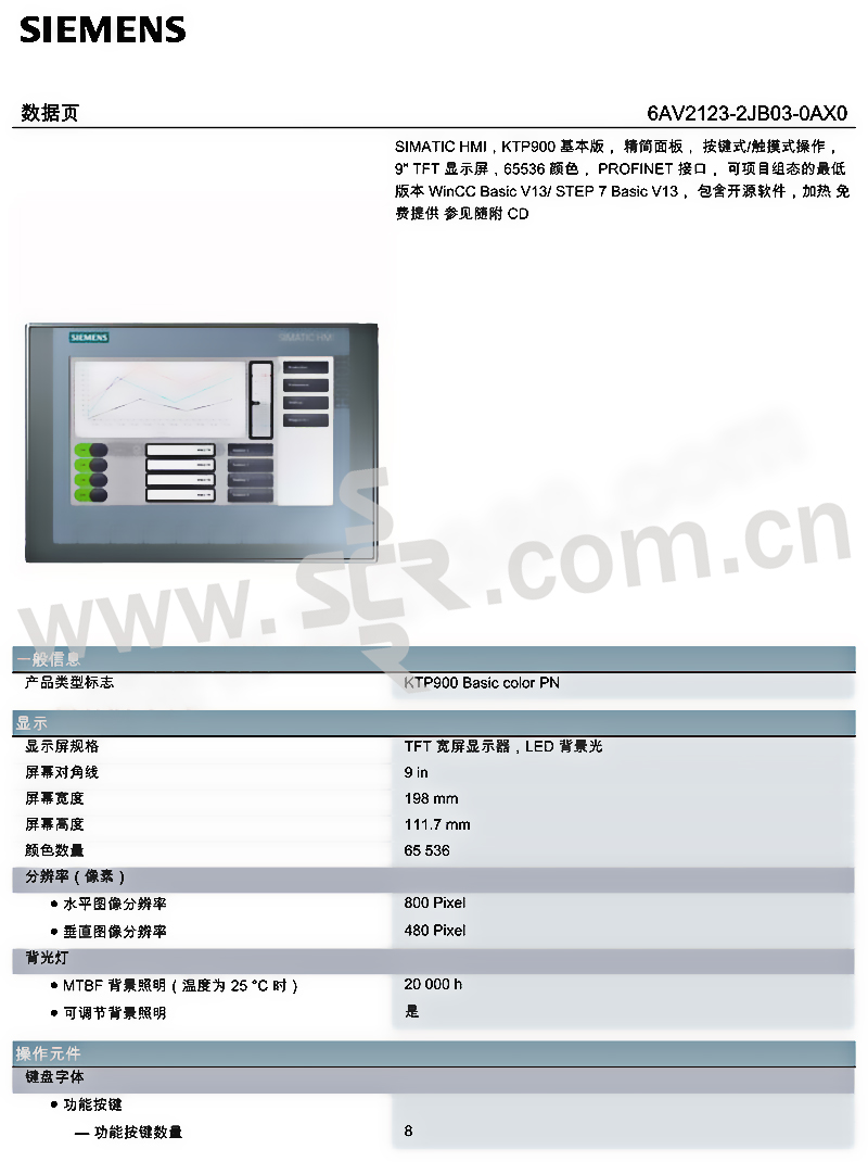 ·SIMATIC HMI,KTP900 基本版, 精简面板, 按键式/触摸式操作, 9" TFT 显示屏,65536 颜色, PROFINET 接口, 可项目组态的最低版本 WinCC Basic V13/ STEP 7 Basic V13, 包含开源软件
