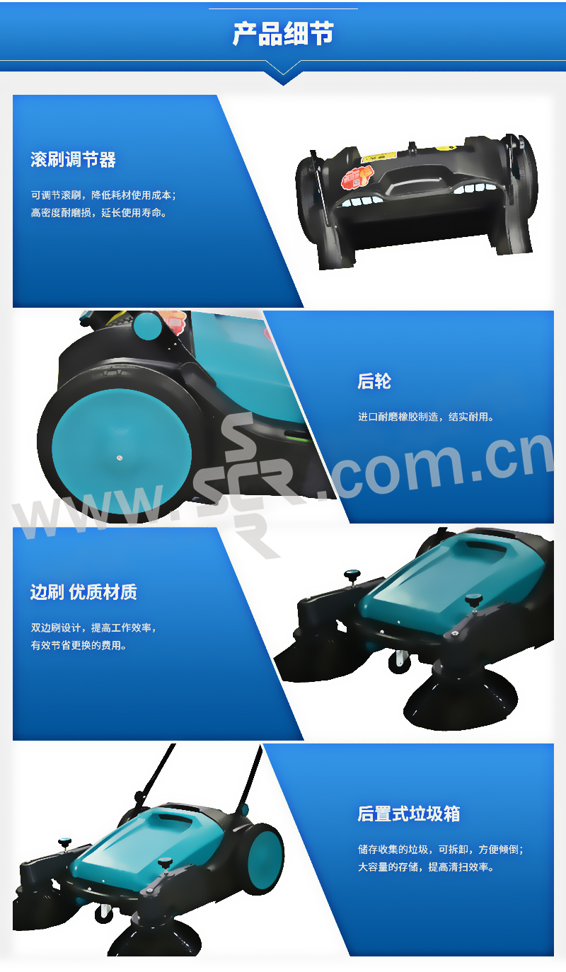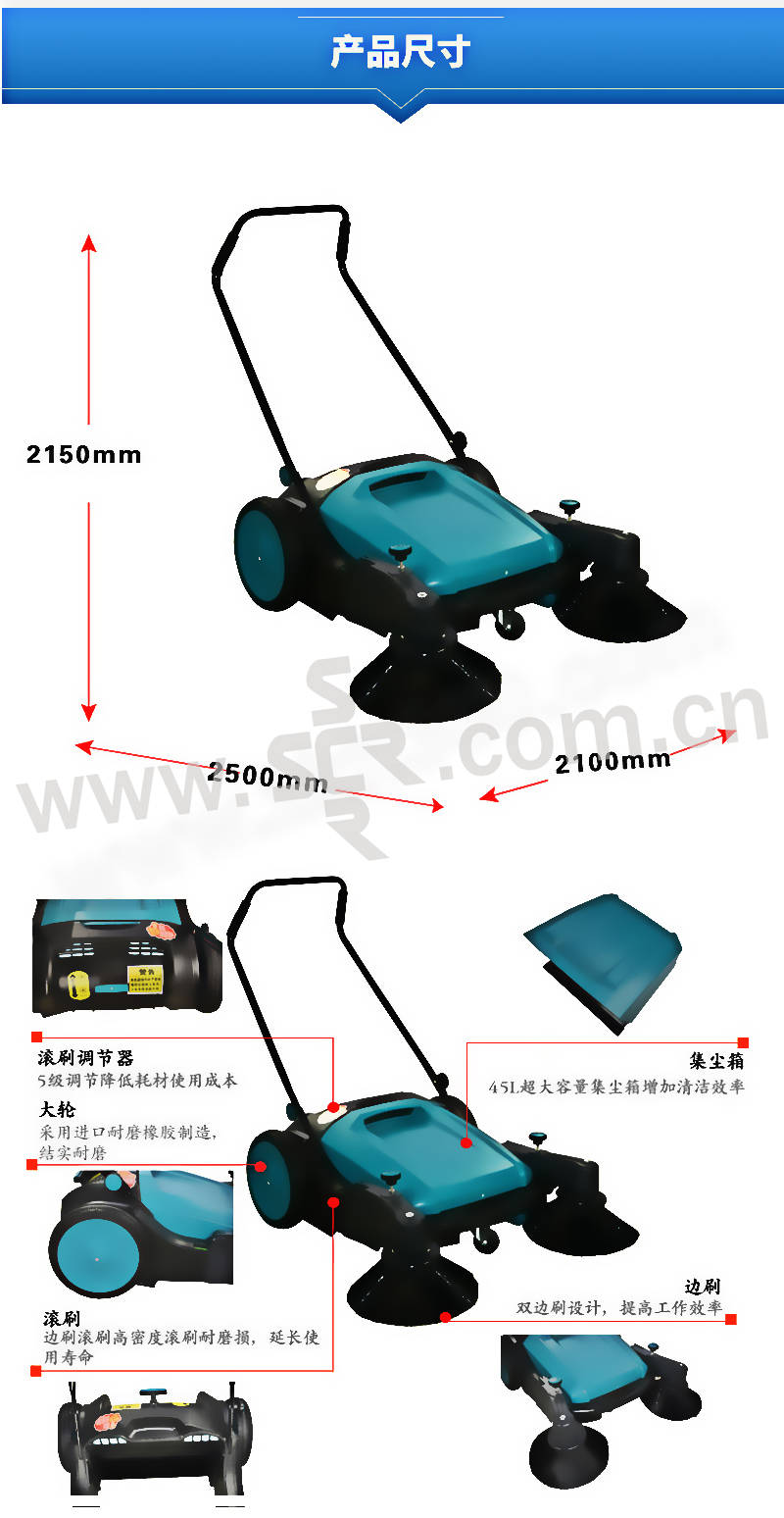 ·手推式吸尘扫地机设计轻巧轻便,环保经济适用。具有强劲的清扫系统和高效吸尘,过滤系统能够使垃圾一扫而光。无需专业操作人员;·40L垃圾箱倾倒垃圾更便携方便;·配备手动式振动器彻底清空过滤器,垃圾清理更彻底;·易损件(边刷、主刷)更换快捷方便,无需专业工具机器操作更灵便