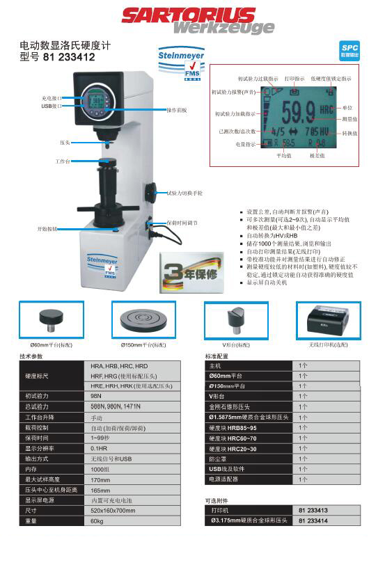·设置公差,自动判断并报警(声音) ·可多次测量(可选2~9次),自动显示平均值和极差值(最大和最小值之差)自动转换为HV或HB ·储存1000个测量结果,浏览和输出自动打印测量结果(无线打印)带校准功能并对测量结果进行自动修正 ·测量硬度较低的材料时(如塑料),硬度值较不稳定,通过锁定功能自动获得准确的硬度值 ·显示屏自动关机