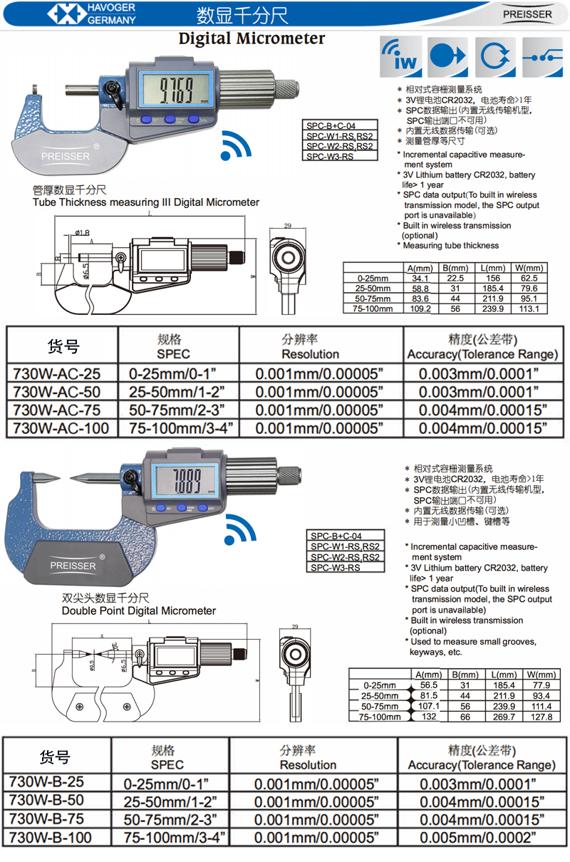 * 相对式容栅测量系统* 3V锂电池CR2032,电池寿命>1年* SPC数据输出(内置无线传输机型,SPC输出端口不可用)* 内置无线数据传输(可选)* 测量管厚等尺寸