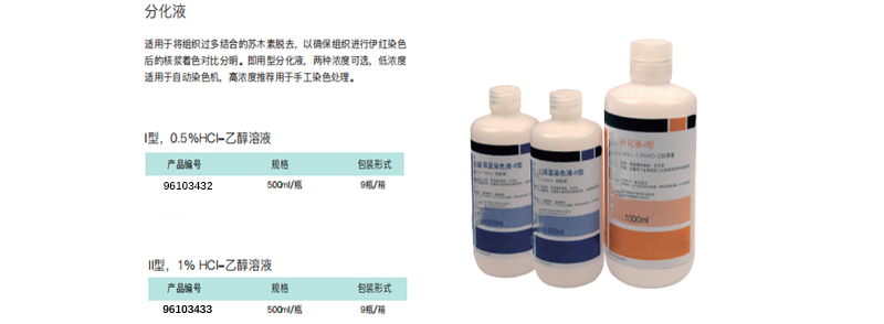 ·适用于将组织过多结合的苏木素脱去,以确保组织进行伊红染色 后的核浆着色对比分明。即用型分化液,两种浓度可选,低浓度