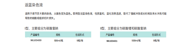 ·即用型返蓝染色液,性质温和,蓝化效果迅速,取代了强碱冲洗或长时间自来水冲洗可能 导致的细胞或组织切片损失。