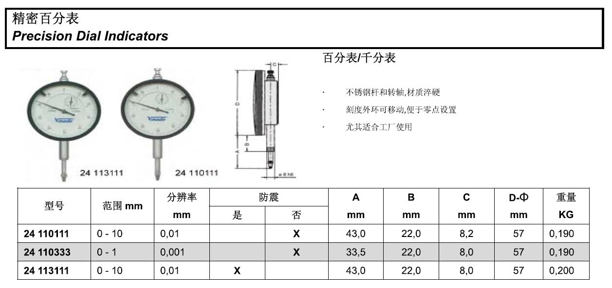·不锈钢杆和转轴·材质淬硬 ·刻度外环可移动·便于零点设置 ·尤其适合工厂使用