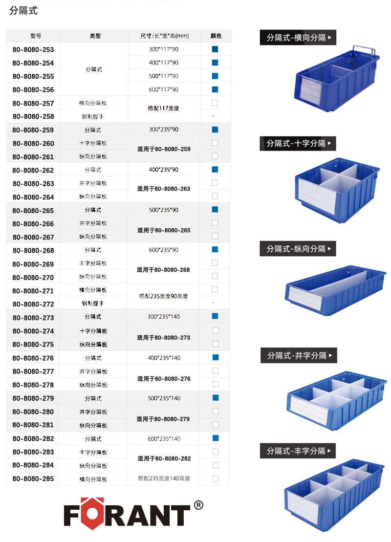 订货号 制造商型号 外形尺寸(长×宽×高) 最多可用横/纵分数隔片 颜色 内径尺寸(长×宽×高) 价格 购物车