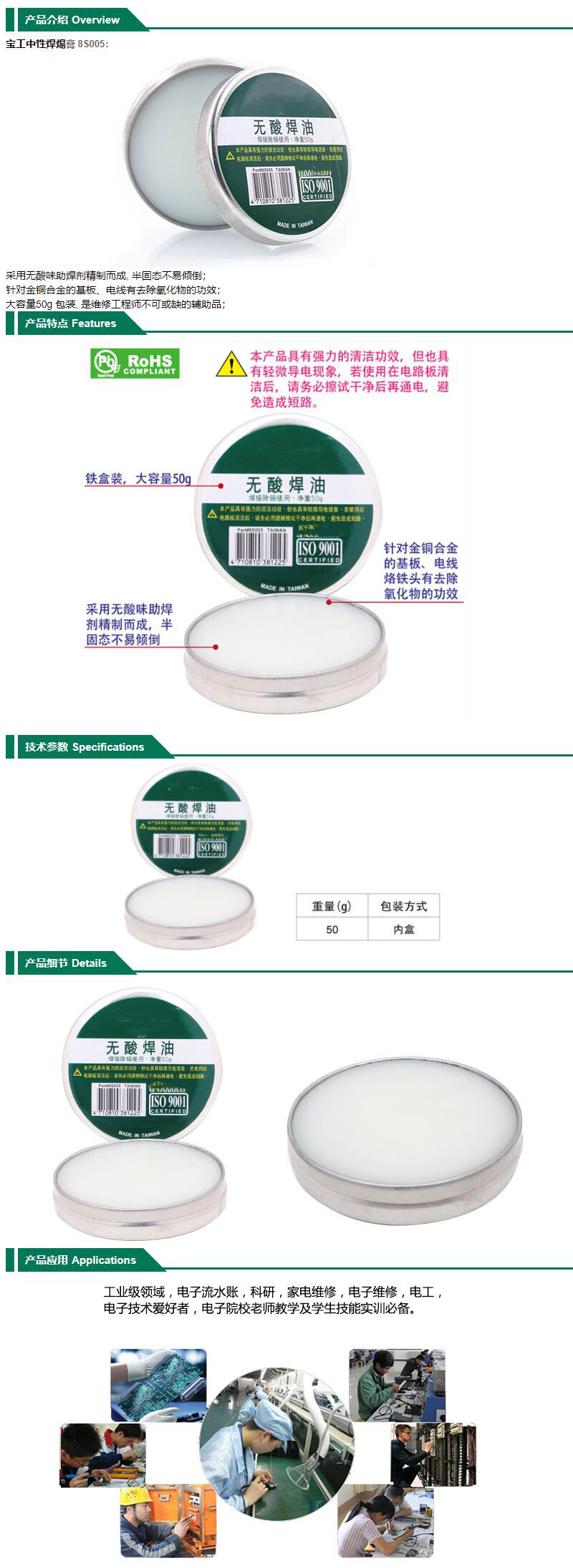 ·采用无酸味助焊剂精制而成,半固态不易倾倒 ·针对金铜合金的基板、电线有去除氧化物的功效 ·大容量50g 包装,是维修工程师不可或缺的辅助品