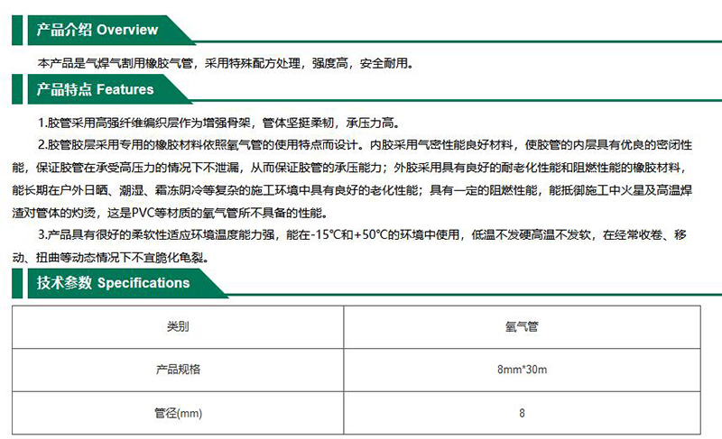 ·胶管胶层采用专用的橡胶材料依照氧气管的使用特点而设计,内胶采用气密性能良好材料,使胶管的内层具有优良的密闭性能,保证胶管在承受高压力的情况下不泄漏,从而保证胶管的承压能力,外胶采用具有良好的耐老化性能和阻燃性能的橡胶材料,能长期在户外日晒、潮湿、霜冻阴冷等复杂的施工环境中具有良好的老化性能,具有一定的阻燃性能,能抵御施工中火星及高温焊渣对管体的灼烫,这是PVC等材质的氧气管所不具备的性能