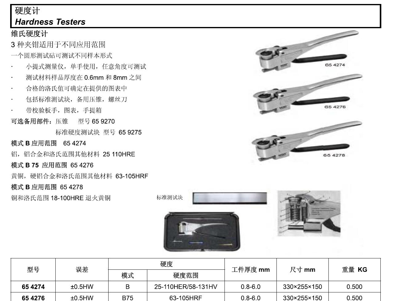 ·3种夹钳适用于不同应用范围 ·一个圆形测试砧可测试不同样本形式 ·小提式测量仪,单手使用,任意角度可测试 ·测试材料样品厚度在0·6mm和8mm之间 ·合格的洛氏值可确定在提供的图表中 ·包括标准测试块,备用压锥,螺丝刀 ·带校验板手,图表,手提箱