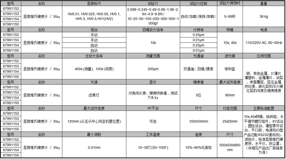 ·10x,40x物镜 ·砝码组 ·水平调节螺钉组件 ·XY试台 ·圆柱试台 ·薄型零件试台 ·平口钳 ·电源线(D型产品还配RS232通讯线) ·滤色片 ·标准显微维氏硬度块 ·水平仪 ·防尘罩 ·(详细见产品出厂装箱单为准) ·钢、有色金属、IC薄片薄塑料、金属薄片、涂层、表面覆层、层压金属热处理、碳化层和淬火硬化层的深度及硬度梯度