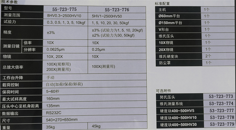 ·根据维氏(HV),可转换为洛氏(HRA,HRB,HRC,HRD,HRE,HRF,HRG,HRK)、布氏(HV)、表面洛氏(HR15N,HR15T,HR30N,HR30Y,HR45N,HR45T)、肖氏(HS)和抗拉强度(Mpa),储存27个测量结果,浏览、打印和输出;带背光LED显示屏;可进行努氏硬度测量