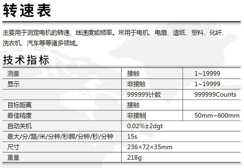 ·数字转速表提供快速,准确的接触与非接触式测量物体表面的转速和旋转速度。 ·测量范围宽,分辨率高。 ·高可见数字液晶显示器和背光显示。 ·激光瞄准。