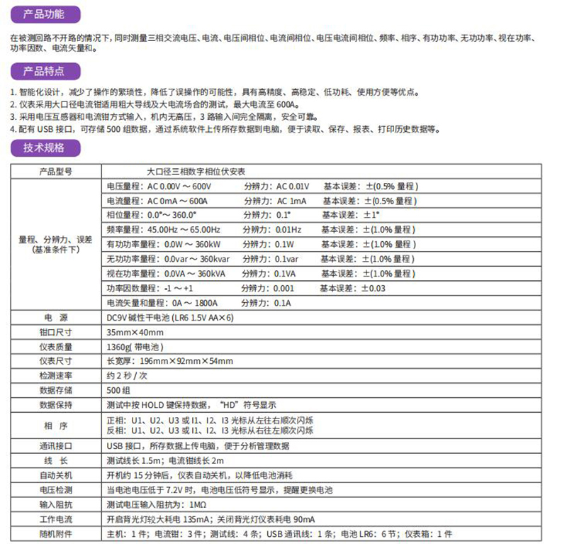 ·智能化设计,减少了操作的繁琐性,降低了误操作的可能性,具有高精度、高稳定、低功耗、使用方便等优点。 ·仪表采用大口径电流钳适用粗大导线及大电流场合的测试,最大电流至600A ·采用电压互感器和电流钳方式输入,机内无高压,3路输入间完全隔离,安全可靠。 ·配有USB接口,可存储50O组数据,通过系统软件上传所存数据到电脑,便于读取、保存、报表、打印历史数据等。
