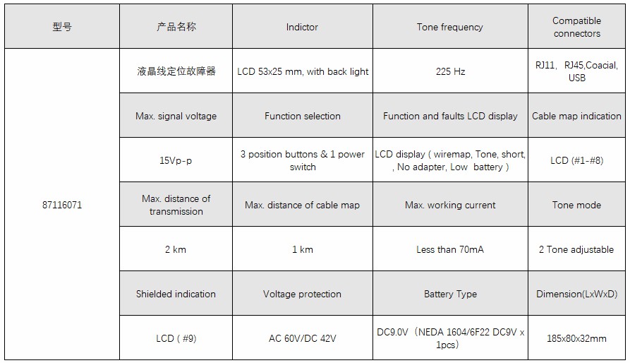 A35300 87116071 225赫兹 2公里 - LCD 53×25 mm,背光 1公里 小于70 mA 2调可调 RJ 11,RJ 45,Coacial,USB 15 Vp-p 3个位置按钮和1个电源开关 液晶显示器(线图,音调,短,无适配器,低) 电池) 液晶显示器(#1-#8) 液晶显示器(#9) Ac 60V/DC 42 V DC9.0V(NEDA 1604/6F22 DC9V × 1 pcs) 185×80×32毫米 962.50