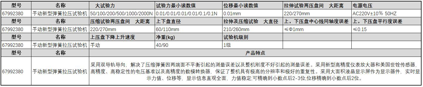 ·采用双导轨导向,解决了压缩弹簧因两端面不平衡引起的测量误差以及整机刚度不好引起的测量误差。 ·采用新型高精度仪表放大器和美国世铨传感器,高精度、高稳定性的电压基准以及高精度的数模转换器,保证了整机具有极高的分辨率和极好的重复性。 ·采用大面积液晶显示屏作为显示器件,实时显示力值、位移等,显示信息直观全面,力值稳定;可精确到小数点后2-3位; ·位移精确到小数点后2位。