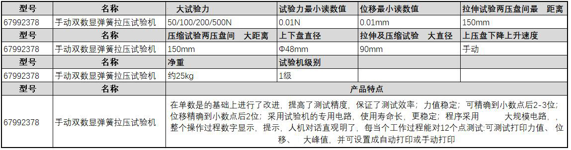 ·在单数是的基础上进行了改进,提高了测试精度,保证了测试效率; ·力值稳定; ·可精确到小数点后2-3位; ·位移精确到小数点后2位; ·采用试验机的专用电路,使用寿命长,更稳定; ·程序采用先进的大规模电路,,整个操作过程数字显示,提示,人机对话直观明了, ·每当个工作过程能对12个点测试:可测试打印力值、 位移、最大峰值,并可设置成自动打印或手动打印