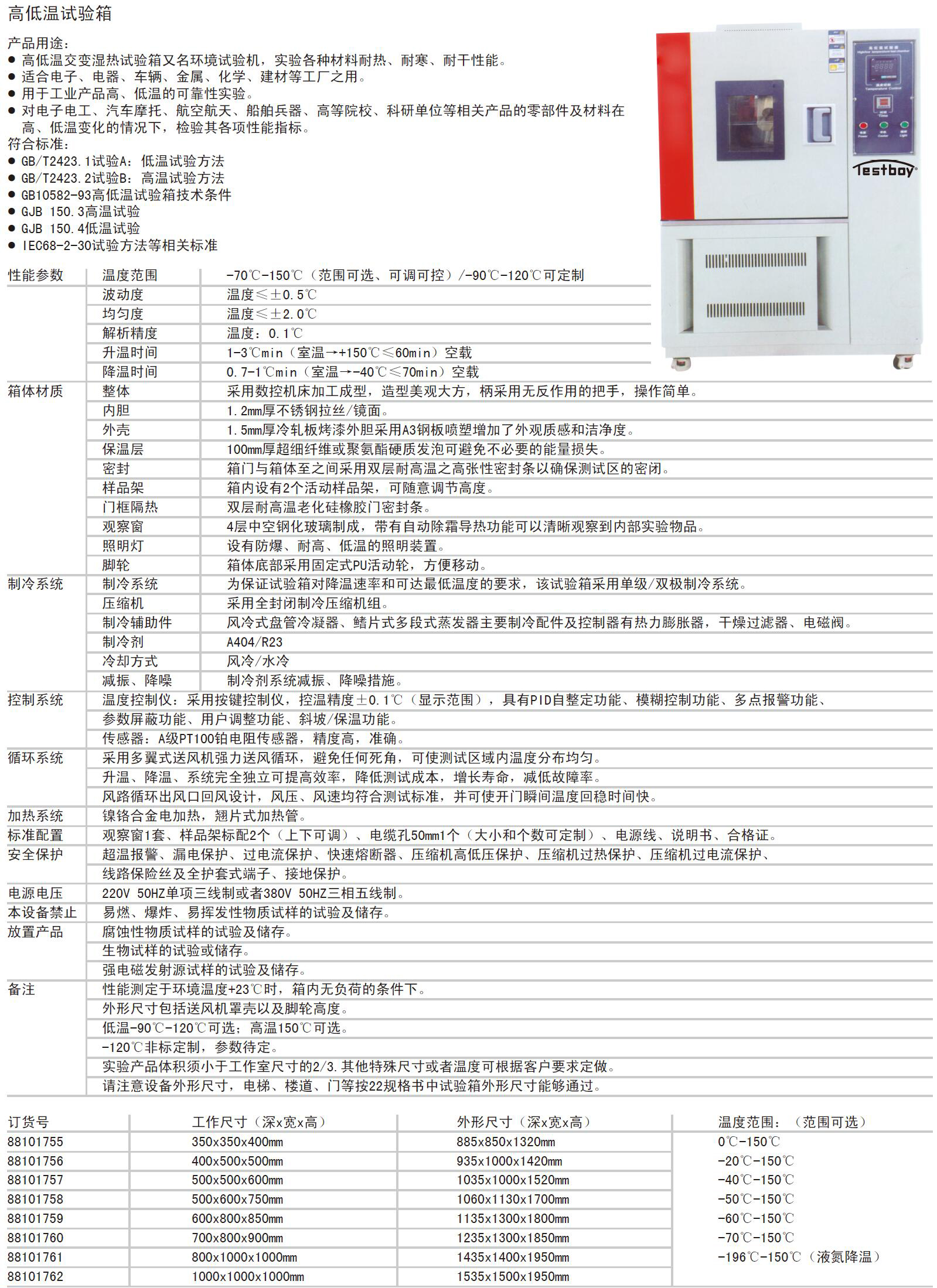 A51861 88101760 220V 50HZ单项三线制或者380V 50HZ三相五线制。 "0℃-150℃ -20℃-150℃ -40℃-150℃ -50℃-150℃ -60℃-150℃ -70℃-150℃ -196℃-150℃(液氮降温) " 温度≤±2.0℃/温度≤±0.5℃ 700×800×900mm 1235×1300×1850mm 199595.00