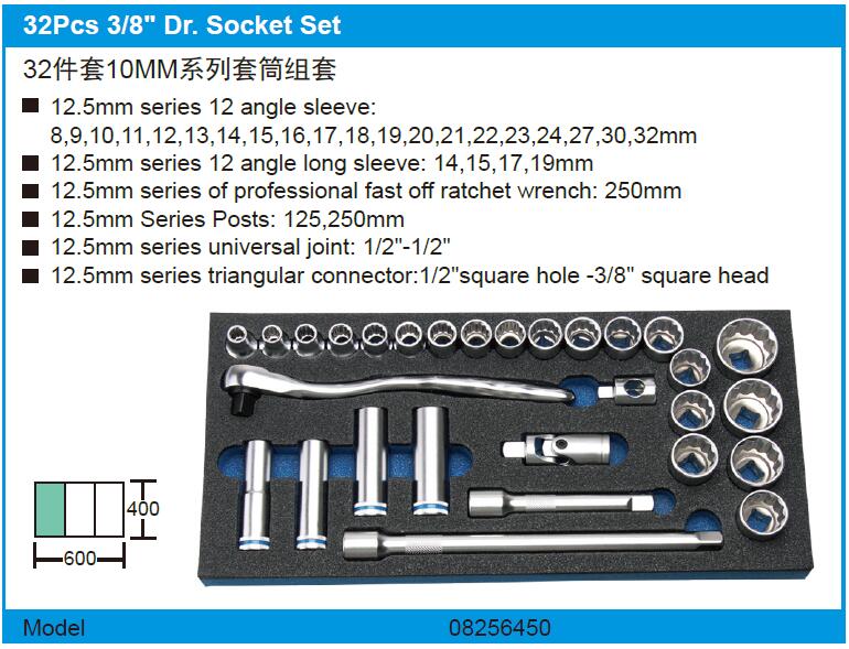 12.5mm系列12角套: 8 9 10 11 12 13 14 15 16 17 18 19 20 21 22 23 24 27 30 32mm 12.5mm系列12角长套筒: 14 15 17 19mm 12.5mm系列专业快速棘轮扳手: 250mm 12.5mm系列接杆: 125 250mm 12.5毫米系列万向节: 1/2“~1/2” 12.5mm系列三角连接器: 1/2“方孔-3/8”方头