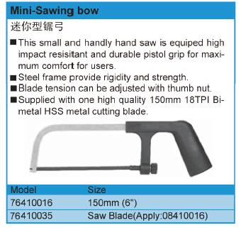 ·这把小而灵巧的手锯装得很高,抗冲击和持久的手枪握把钢架提供了刚性和强度。叶片张力可以用拇指螺母调节。提供一个高质量的150mm18TPIBi-金属高速钢金属切削刀片。